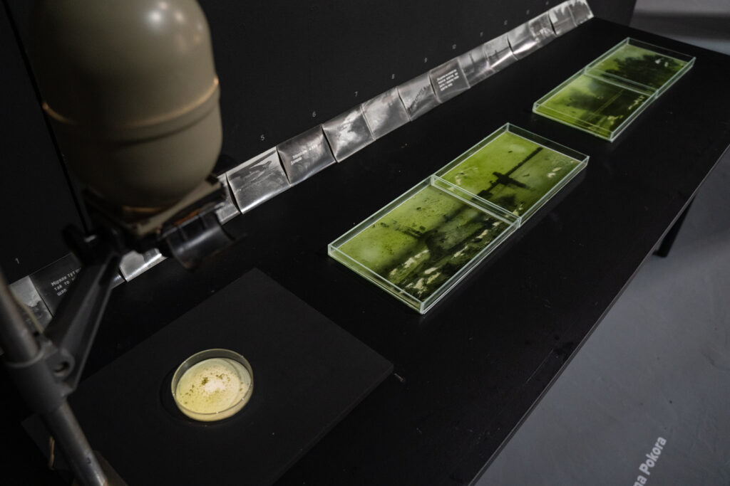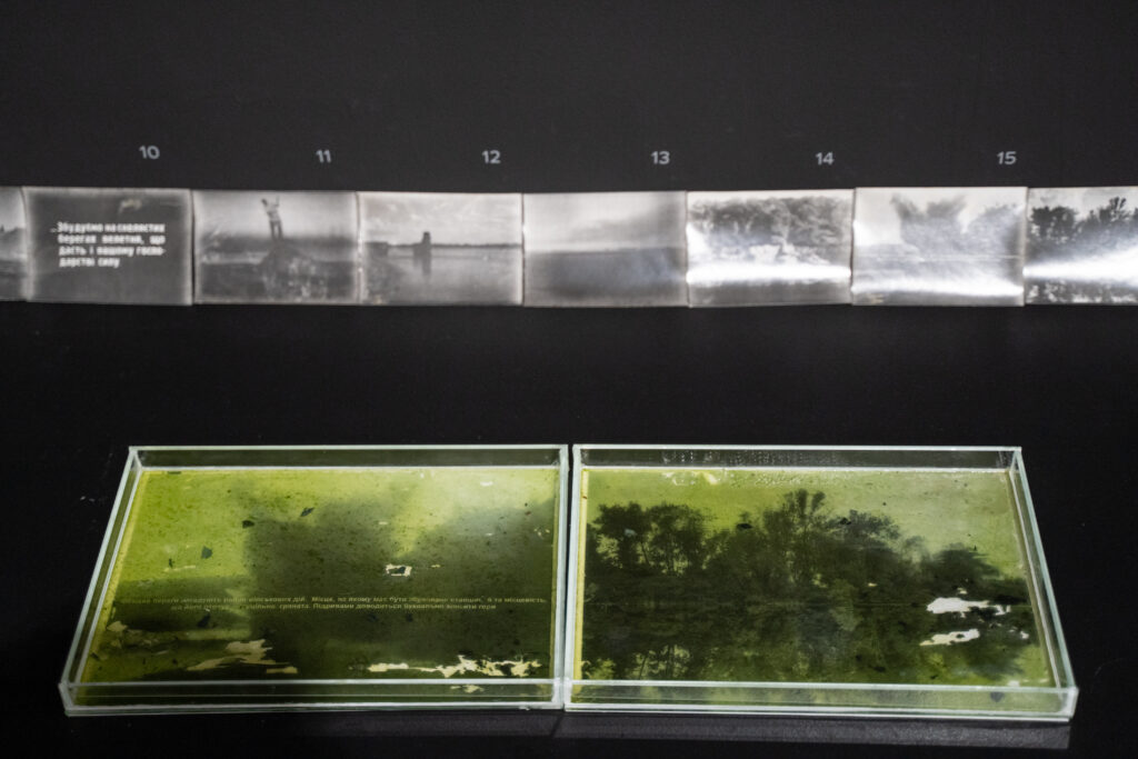 In her project ‘The Colour of Cyan’, the artist examines the phenomenon of algal bloom as one of the consequences of regulating the flow of the Dnipro. The creation of reservoirs has led to the proliferation of cyanobacteria (blue-green algae). Billions of years ago, their photosynthetic activity contributed to the formation of an oxygen-rich atmosphere. Yet their excessive growth (the characteristic green bloom in summer) leads to an increased toxin concentration and the loss of biodiversity. Their high capacity to adapt to changing conditions is possible thanks to the interconnections within an ecosystem. Thus, even the most inconspicuous organisms participate in the creation of worlds. Kateryna’s project also shows the impact of historical changes on interspecies relations—blooms are a visible consequence of the interaction between anthropogenic influences and natural adaptation, which creates conditions either for the flourishing or the collapse of ecosystems.