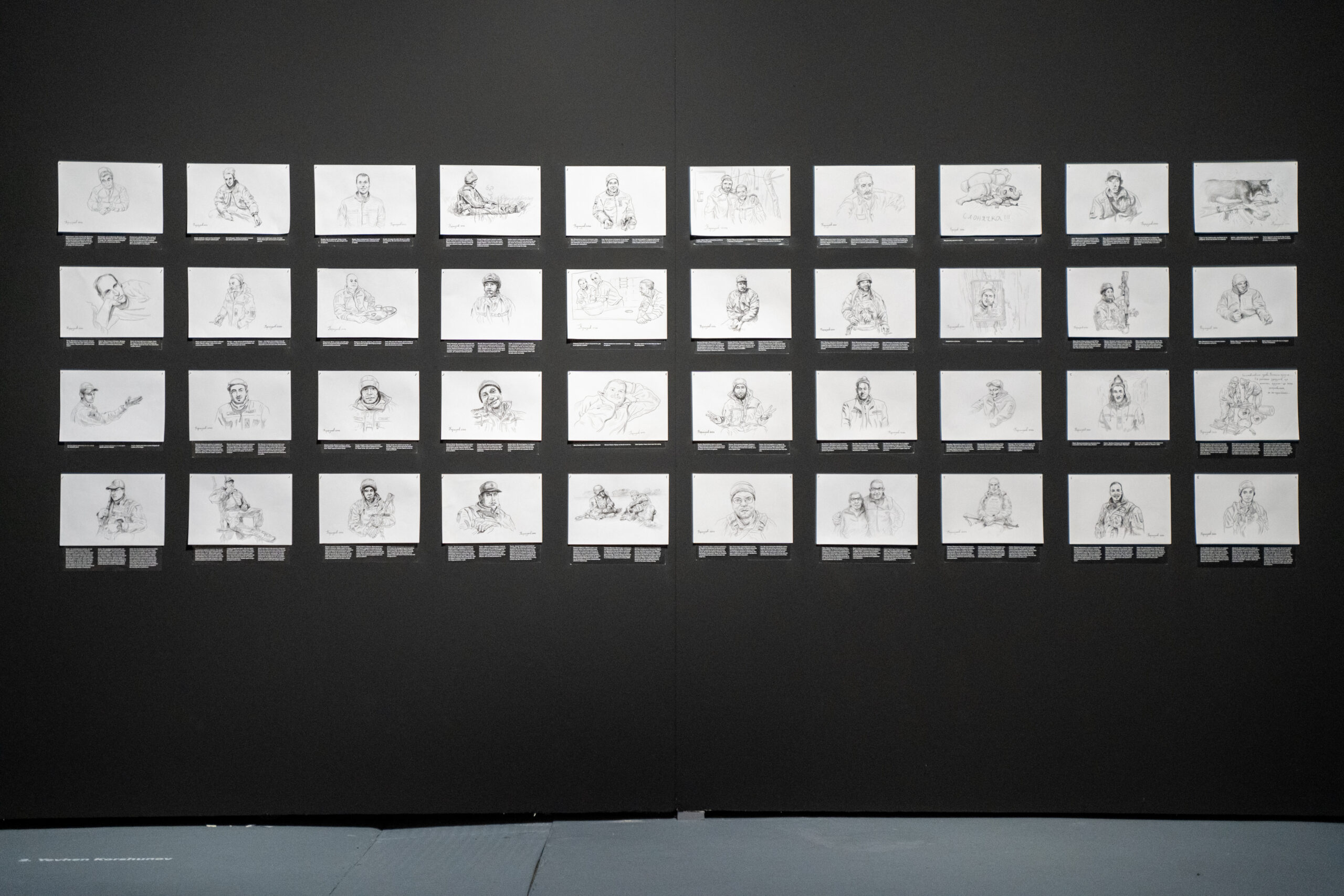 Рисунки схоплюють образи побратимів та елементи армійського життя. Перепочинок, розмова, перекур; в наряді на їдальні; солдат Микола показує, як дрон відтяв йому пів пальця; солдат Андрій, який сумує за родиною; солдат Сашко, котрий насправді вчитель історії… У своїх рисунках Євген розповідає їх історії і через образи які створює, і через тексти – зображення він доповнює розповідями про своїх персонажів. Люди, що змушені були стати солдатами, проявлені через людське і людяне, яке художник вихоплює серед армійської рутини.